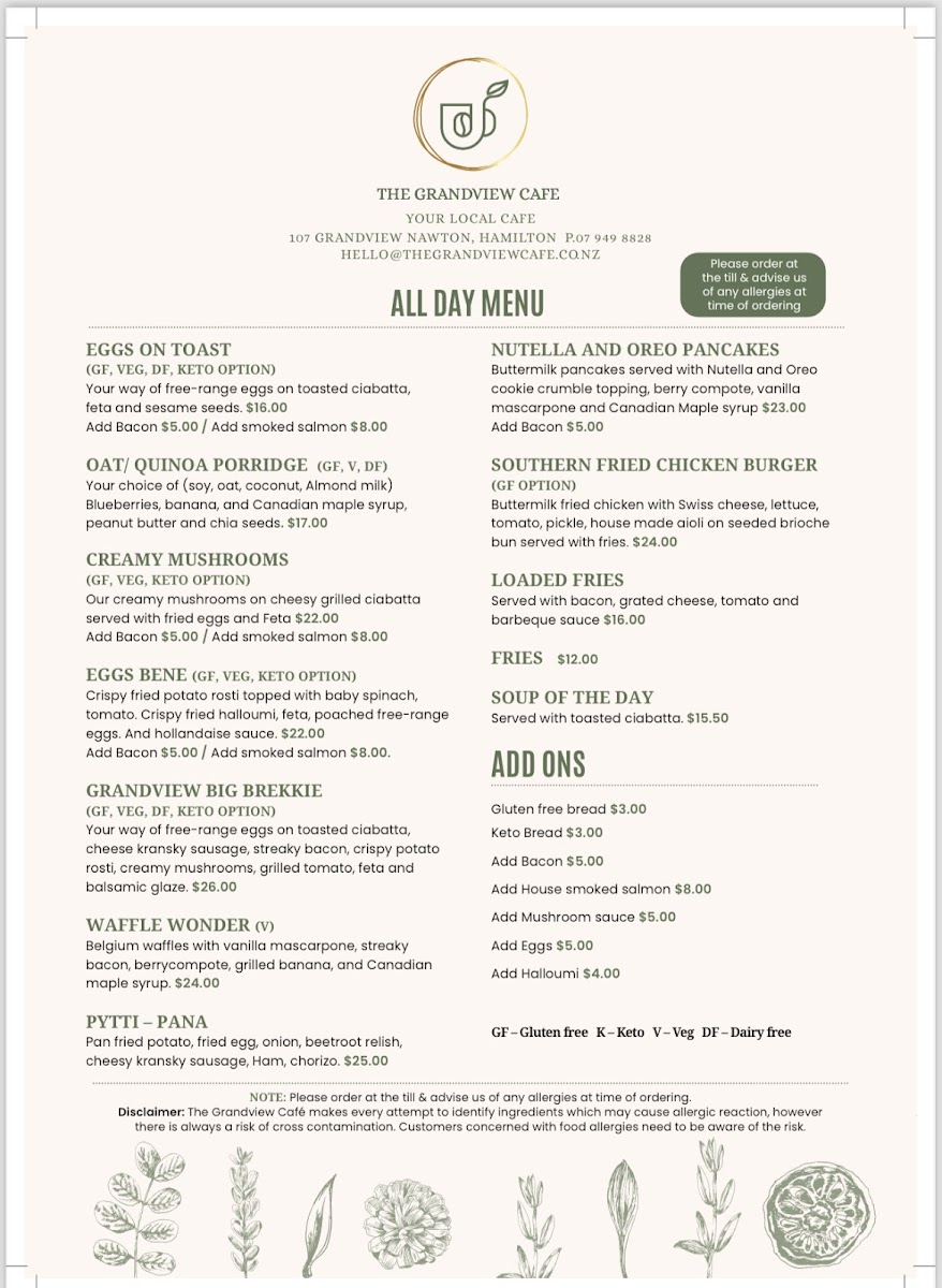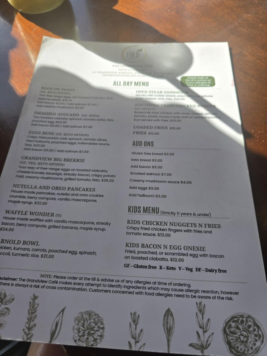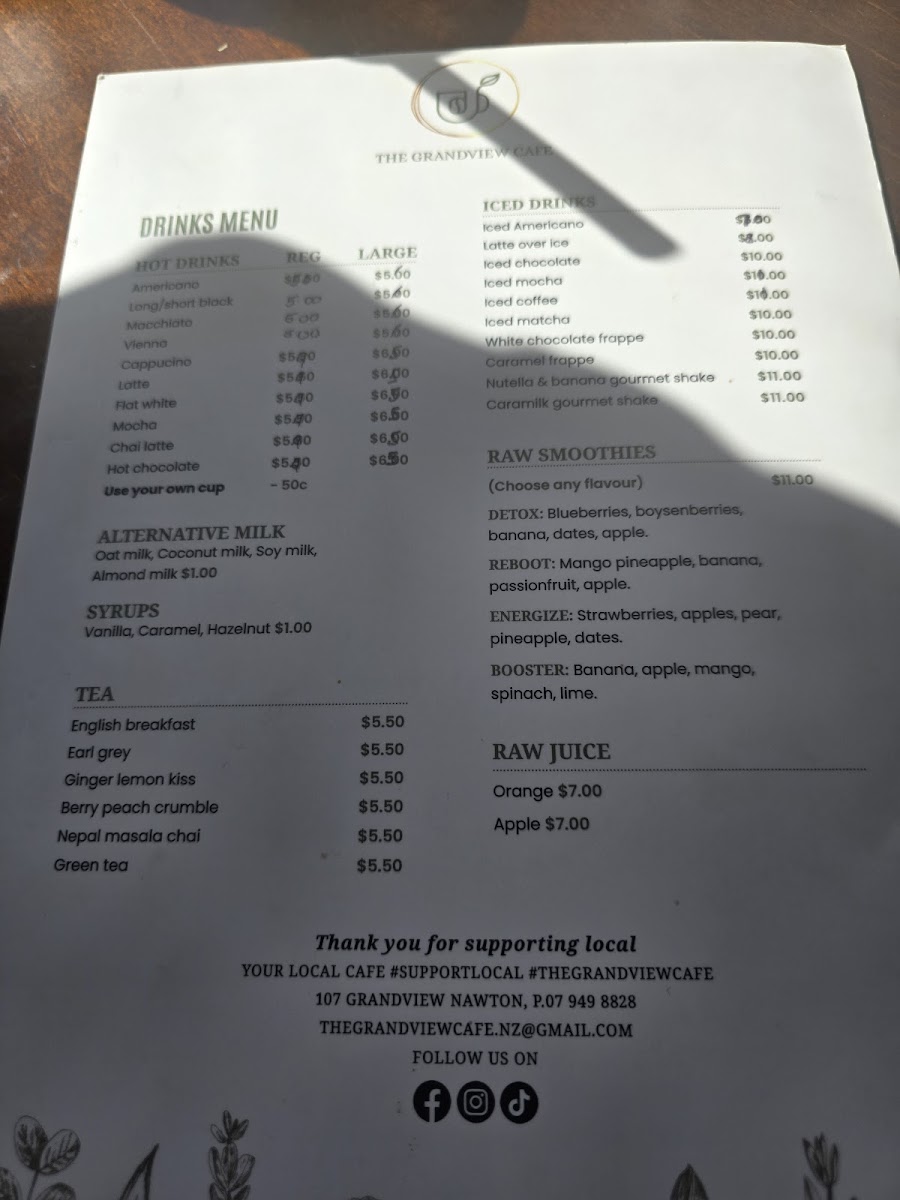Overall, The Grandview Cafe provides a well-rounded selection of delicious dishes for breakfast, lunch, and snacks, all reasonably priced to suit various budgets. Whether you're popping in for a quick coffee or enjoying a leisurely meal with friends and family, this cafe offers a satisfying dining experience.